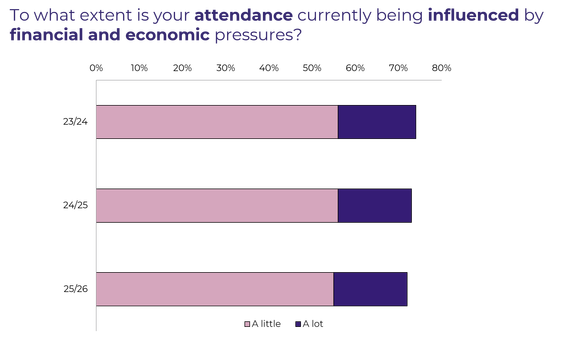 At Indigo we keep an eye on how much audiences feel that financial and economic factors are affecting their attendance. Our Indigo Share benchmark, of over 200K attenders within the last year, shows that almost ¾ of those who are attending say that it is affecting their attendance ‘a little’ or ‘a lot’.
